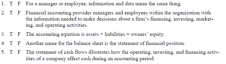 1. T F For a manager or employee, information and data mean the same thing. 2. T F Financial accounting provides managers and employees within the organization with the information needed to make decisions about a firm's financing, investing, market- ing, and operating activities. 3. T F The accounting equation is assets + liabilities = owners' equity. 4. T F Another name for the balance sheet is the statement of financial position. 5. T F The statement of cash flows illustrates how the operating, investing, and financing activ- ities of a company affect cash during an accounting period.