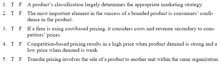 1. T F A product's classification largely determines the appropriate marketing strategy. 2. T F The most important element in the success of a branded product is consumers' confi- dence in the product. 3. T F If a firm is using cost-based pricing, it considers costs and revenue secondary to com- petitors' prices. 4. T F Competition-based pricing results in a high price when product demand is strong and a low price when demand is weak. 5. T F Transfer pricing involves the sale of a product to another unit within the same organization.