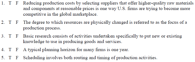 1. T F Reducing production costs by selecting suppliers that offer higher-quality raw materials and components at reasonable prices is one way U.S. firms are trying to become more competitive in the global marketplace. 2. T F The degree to which resources are physically changed is referred to as the focus of a production process. 3. T F Basic research consists of activities undertaken specifically to put new or existing knowledge to use in producing goods and services. 4. T F A typical planning horizon for many firms is one year. 5. T F Scheduling involves both routing and timing of production activities.