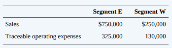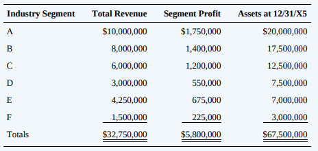 Segment E Segment W Sales $750,000 $250,000 Traceable operating expenses 325,000 130,000 Sales Traceable Costs Allocable Costs Segment A $400,000 $225,000 Segment B 300,000 240,000 Segment C 200,000 135,000 Totals $900,000 $600,000 $150,000 Industry Segment Total Revenue Segment Profit Assets at 12/31/X5 A $10,000,000 $1,750,000 $20,000,000 В 8,000,000 1,400,000 17,500,000 C 6,000,000 1,200,000 12,500,000 D 3,000,000 550,000 7,500,000 E 4,250,000 675,000 7,000,000 F 1,500,000 225,000 3,000,000 Totals $32,750,000 $5,800,000 $67,500,000