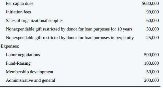 Per capita dues $680,000 Initiation fees 90,000 Sales of organizational supplies 60,000 Nonexpendable gift restricted by donor for loan purposes for 10 years 30,000 Nonexpendable gift restricted by donor for loan purposes in perpetuity 25,000 Expenses: Labor negotiations 500,000 Fund-Raising 100,000 Membership development 50,000 Administrative and general 200,000