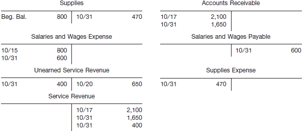 Supplies Accounts Receivable 2,100 1,650 Beg. Bal. 800 10/31 470 10/17 10/31 Salaries and Wages Expense Salaries and Wages Payable 10/15 800 10/31 600 10/31 600 Unearned Service Revenue Supplies Expense 10/31 400 10/20 650 10/31 470 Service Revenue 10/17 2,100 1,650 10/31 10/31 400