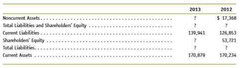 > Selected balance sheet amounts for SinoTwelve, a Chinese manufacturer, appear next. All amounts are in thousands of U.S. dollars ($). Compute the missing amounts. 2013 2012 Total Assets. $5,450,838 Current Liabilities . Current Assets Total Liabilit