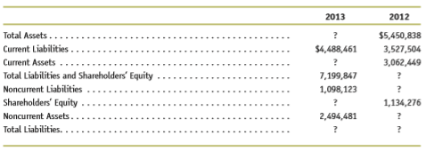 2013 2012 Total Assets. $5,450,838 Current Liabilities . Current Assets Total Liabilities and Shareholders' Equity $4,488,461 3,527,504 3,062,449 7,199,847 Noncurrent Liabilities 1,098,123 ? Shareholders' Equity 1,134,276 ... Noncurrent Assets.. 2,494,481 Total Liabilities. ?