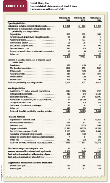 2013 2012 2011 Inflows of Cash Proceeds from Long-Term Borrowings.. $ 836 $ 5,096 $ 3,190 Revenues from Operations Increasing Cash 19,536 19,083 17,233 Issue of Common Stock ... 67 37 3 Sale of Property, Plant, and Equipment. 332 401 220 Other Investing Transactions. . 71 $20,842 268 Total Inflows... $24,617 $20,914 Outflows of Cash Acquisition of Property, Plant, and Equipment.. $ 3,678 $ 3,640 $ 1,881 Expenses for Operations Decreasing Cash 16,394 18,541 18,344 Repayments of Long-Term Debt.... 766 922 687 Other Investing Activities Total Outflows....... 1,501 ... $20,838 $24,604 $20,912 Great Deal, Inc. Consolidated Statements of Cash Flows EXHIBIT 1.3 (amounts in millions of US$) Febnary 27. 2013 Febnuary 21. 2012 Febnuary 2. 2011 Operating Activities Not amings indludng noncontroling intorosts Adustmonts to Oonce net earings to total cash providad by oporating actvties: Depreciation.. Amortization of denite vadintangible sets $1.394 $ 1033 S1410 730 580 1 Asset impaiments. 4 177 Restruchuring darges - Stock based compensation 52 78 118 110 105 Delered income taes.. (30 Excess tax benefits trom sodtned compensation. Omer, net.. (7) 2,139 12 2,45 2,154 Changes in operating assets, net of acquired assets and atiitios Recevatles. 1419 12 Morchande montories 258 562) Ober assets (17 42 Accounts paatle. Oher labtus. Income tas Total cash provided by operating activites 141 19 221 279 99 2025 103 2,206 1,877 Investing Activities Aations to PRE, et of non cash expendtres 1,30 (797 Purchases of inostments 501 Sales of investments.. Acqukilions of businessas, net of cash aoquired. Change n estricted cash Settement of net investment hedges. Omet, net... Total cash busad providad by investing actMtes. 56 246 10.935 18 40 (16 02) 1464 Financing Activities Ropurchara of common stock Issuance of common slock 138 83 146 Dvidends pad. Repaymants of date 6,3 4,712) 4.353 Procods from issuance of debt 5,132 5606 4.486 Acqukillon of noncontroling interecsts. Excess tax benefits hrom socktasad componsation 24 Ohet, net... Total cash used i providad by financing activtes. (18 S01 Effect of exchange rate changes in cash. Increase (decrease) in cash and cash equivalents Cash and cash equivalents at beginning of year Cash and cash equivalents at end of year. 19 122 1,2 233 1,438 $4 498 1,205 $1438 1826 Supplemental disclosure of cash flow infomation: Income tas pad. Inteet paid. 732 644 78 49