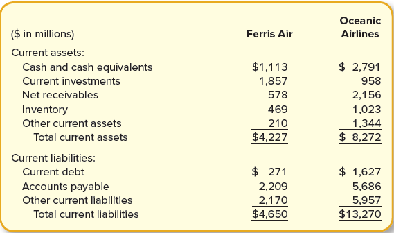 Selected financial data regarding current assets and current liabilities for Ferris Air and Oceanic Airlines are provided as follows: