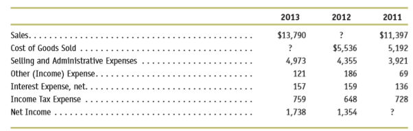 2013 2012 2011 Sales.... $13,790 ? $11,397 Cost of Goods Sold ? $5,536 5,192 Selling and Administrative Expenses Other (Income) Expense. Interest Expense, net... Income Tax Expense 4,973 4,355 3,921 121 186 69 157 159 136 759 648 728 Net Income 1,738 1,354