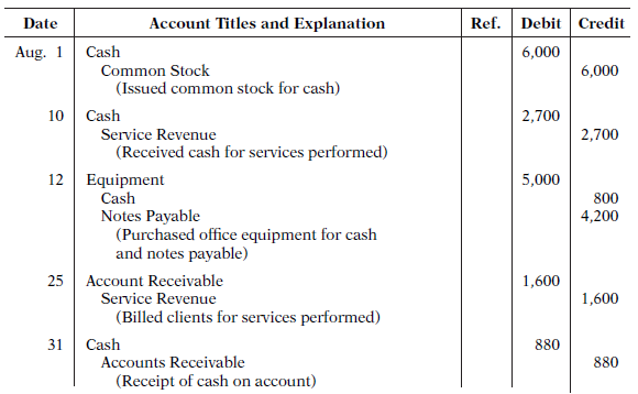 Date Account Titles and Explanation Ref. Debit Credit Aug. 1 Cash 6,000 Common Stock 6,000 (Issued common stock for cash) 10 Cash 2,700 Service Revenue 2,700 (Received cash for services performed) 12 Equipment Cash 5,000 800 Notes Payable (Purchased office equipment for cash and notes payable) 4,200 25 Account Receivable 1,600 Service Revenue 1,600 (Billed clients for services performed) Cash Accounts Receivable 31 880 880 (Receipt of cash on account)