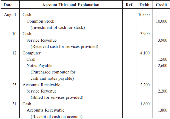 Date Account Titles and Explanation Ref. Debit Credit Aug. 1 Cash 10,000 Common Stock 10,000 (Investment of cash for stock) 10 Cash 3,900 Service Revenue 3,900 (Received cash for services provided) 12 Computer 4,100 Cash 1,500 Notes Payable 2,600 (Purchased computer for cash and notes payable) 25 Accounts Receivable 2,200 Service Revenue 2,200 (Billed for services provided) 31 Cash 1,800 Accounts Receivable 1,800 (Receipt of cash on account)