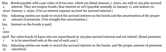 May Bonds payable with a par value of $700,000, which are dated January 1, 2020, are sold at 105 plus accrued 1, interest. They are coupon bonds, bear interest at 12% (payable annually at January 1), and mature on 2020 January 1, 2030. (Use an interest expense account for accrued interest.) Dec. Adjusting entries are made to record the accrued interest on the bonds and the amortization of the proper amount of premium. (Use straight-line amortization.) 31 Jan. Interest on the bonds is paid. 1, 2021 April Par value bonds of $420,000 are repurchased at 103 plus accrued interest and are retired. (Bond premium is to be amortized only at the end of each year.) Dec. Adjusting entries are made to record the accrued interest on the bonds, and the proper amount of premium 31 amortized.