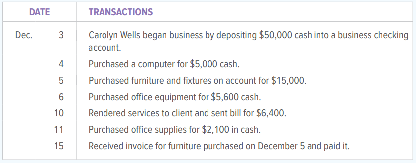 Several transactions that occurred during December 20X1, the first month of operation for Wellsâ Accounting Services, follow. The company uses the general ledger accounts listed below.