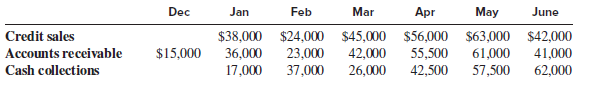 Dec Jan Feb Mar Apr May June Credit sales $38,000 $24,000 $45,000 $56,000 $63,000 $42,000 41,000 62,000 Accounts receivable $15,000 36,000 23,000 37,000 42,000 55,500 61,000 Cash collections 17,000 26,000 42,500 57,500