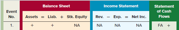 Show the effect of each of the following independent accounting events on the financial statements using a horizontal statements model like the following one. Use + for increase, â for decrease, and NA for not affected. The first event is recorded as an example.
