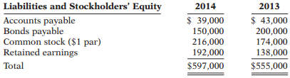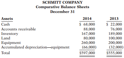SCHMITT COMPANY Comparative Balance Sheets December 31 Assets 2014 2013 $ 68,000 $ 22,000 76,000 189,000 100,000 200,000 (32,000) Cash Accounts receivable 88,000 167,000 80,000 260,000 (66,000) Inventory Land Equipment Accumulated depreciation-equipment Total $597,000 $555,000 Liabilities and Stockholders' Equity 2014 2013 $ 39,000 150,000 216,000 192,000 $ 43,000 Accounts payable Bonds payable Common stock ($1 par) Retained earnings 200,000 174,000 138,000 Total $597,000 $555,000