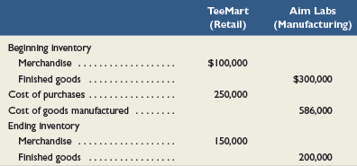 TeeMart Aim Labs (Retail) (Manufacturing) Beginning Inventory Merchandise $100,000 ... Finished goods Cost of purchases .... Cost of goods manufactured $300,000 250,000 586,000 Ending Inventory Merchandise 150,000 ... Finished goods 200,000