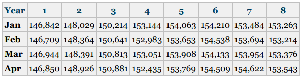 Year 1 2 3 4 5 6 7 8 Jan 146,842 148,029 150,214 153,144 154,063 154,210 153,484 153,263 Feb 146,709 148,364 150,641 152,983 153,653 154,538 153,694 153,214 Mar 146,944 148,391 150,813 153,051 153,908 154,133 153,954 153,376 Apr 146,850 148,926 150,881 152,435 153,769 154,509 154,622 153,543