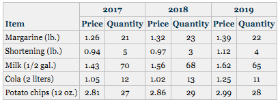 Shown here are retail price figures and quantity estimates for five different food commodities over 3 years. Use these data and a base year of 2017 to compute unweighted aggregate price indexes for this market basket of food. Using a base year of 2017, calculate Laspeyres price indexes and Paasche price indexes for 2018 and 2019.