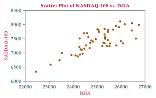 Shown here is a scatter plot of the NASDAQ 100 Index versus the Dow Jones Industrial Average on Friday closings over a period of one year (January 12, 2018 to January 4, 2019). What does the graph tell you about the relationship of the NASDAQ 100 Index to the Dow Jones Industrial Average? Explain what you observe in the graph and share any conclusions that you reach. The NASDAQ 100 data were obtained from the Federal Reserve Bank of St. Louis, and the Dow Jones Industrial Averages were obtained from measuringworth.com.