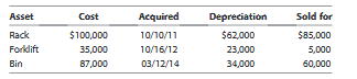 Asset Cost Acquired Depreciation Sold for Rack $100,000 10/10/11 $62,000 $85,000 Forklift 35,000 10/16/12 23,000 5,000 Bin 87,000 03/12/14 34,000 60,000