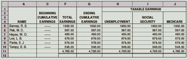 A C F H 1 TAXABLE EARNINGS BEGINNING ENDING 3 CUMULATIVE ТOTAL CUMULATIVE SOCIAL 4 NAME EARNINGS EARNINGS EARNINGS UNEMPLΟΥΜΕΝΤ SECURITY MEDICARE 5 Barney, R. S. 6 Fisk, M. C. 7 Hayes, W. O. 8 Lee, L. B. Parks, S. J 10 Tempy, E. B. 11 12 1932.00 1932.00 1932.00 1932.00 1932.00 567.00 567.00 567.00 567.00 567.00 483.00 483.00 483.00 483.00 483.00 679.00 679.00 679.00 679.00 679.00 9 578.00 578.00 578.00 578.00 546.00 4,785.00 578.00 546.00 4,785.00 546.00 4,785.00 546.00 4,785.00 546.00 4,785.00 -