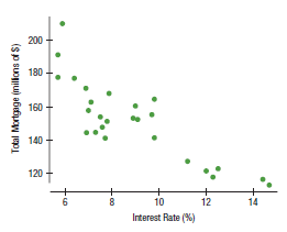 Since 1980, average mortgage interest rates have fluctuated from a low of under 4% to a high of over 14%. Is there a relationship between the amount of money people borrow and the interest rate thatâs offered? Here is a scatterplot of Total Mortgages in the United States (in millions of 2005 dollars) versus Interest Rate at various times over 26 years. The correlation is -0.84.