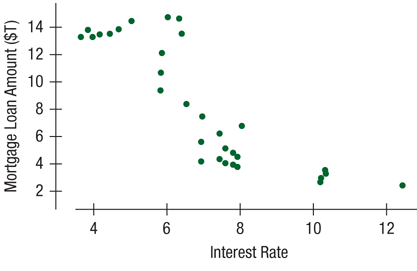 Since 1985, average mortgage interest rates have fluctuated from a low of nearly 3% to a high of over 14%. Is there a relationship between the amount of money people borrow and the interest rate that offered? Here is a scatterplot of Mortgage Loan Amount in the United States (in trillions of dollars) versus yearly Interest Rate since 1985. The correlation is âËâ0.85.