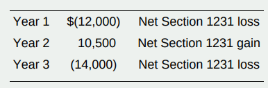 Year 1 $(12,000) Net Section 1231 loss Year 2 10,500 Net Section 1231 gain Year 3 (14,000) Net Section 1231 loss