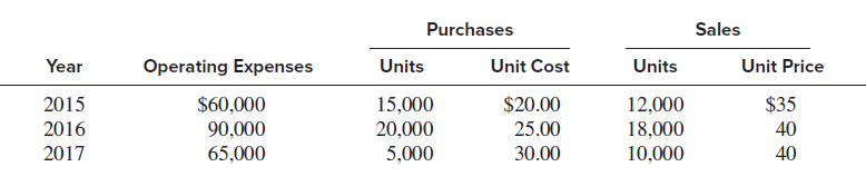Purchases Sales Year Operating Expenses Units Unit Cost Units Unit Price $20.00 25.00 2015 $35 $60,000 90,000 65,000 15,000 12,000 18,000 10,000 2016 20,000 40 2017 5,000 30.00 40