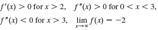 f'(x) > 0 for x > 2, f"(x) > 0 for 0 < x< 3, f"(x) < 0 for x > 3, lim f(x) = -2 X 00