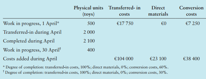 Sligo Toys Ltd manufactures wooden toy figures at its Ballinode plant. It has two departments â the Forming Department and the Finishing Department. (Exercises 4.22 and 4.23 focused on the Forming Department.) Consider now the Finishing Department, which processes the formed toys through hand-shaping and the addition of metal. For simplicity here, suppose all additional direct materials are added at the end of the process. Conversion costs are added evenly during Finishing operations. Sligo Toys uses the weighted-average method of process costing. The following is a summary of the April 2018 operations in the Finishing Department: