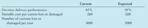 Sloan Moving Ltd transports household goods from one city to another within the UK. It measures quality of service in terms of (1) time required to transport goods, (2) on-time delivery (within 2 days of agreed-upon delivery date), and (3) number of lost or damaged items. Sloan is considering investing in a new scheduling-and tracking system costing £160 000 per year, which should help it to improve performance for items (2) and (3). The following information describes Sloanâs current performance and the expected performance if the new system is implemented: