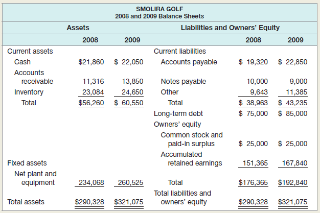 SMOLIRA GOLF 2008 and 2009 Balance Sheets Assets Liabilities and Owners' Equity 2008 2009 2008 2009 Current assets Current liabilities Cash $21,860 $ 22,050 Accounts payable $ 19,320 $ 22,850 Accounts recelvable 11,316 13,850 Notes payable 10,000 9,000 Other Inventory Total 23,084 24,650 $56,260 $ 60,550 9,643 11,385 $ 38,963 $ 43,235 $ 75,000 $ 85,000 Total Long-term debt Owners' equity Common stock and paid-in surplus $ 25,000 $ 25,000 Accumulated Fixed assets retained earnings 151,365 167,840 Net plant and equipment 234,068 260,525 Total $176,365 $192,840 Total liabilities and Total assets $290,328 $321,075 owners' equity $290,328 $321,075 SMOLIRA GOLF, Inc. 2009 Income Statement Sales $305,830 Cost of goods sold 210,935 Depreclation Earnings before interest and taxes Interest paid 26,850 $ 68,045 11,930 $ 56,115 Taxable income Taxes (35%) 19,640 $ 36,475 Net income Dividends $20,000 Retained earnings 16,475
