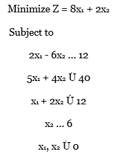 > Solve the following linear programming model graphically: minimize Z = 5x1 + x2 subject to 3x1 + 4x2 = 24 x1 … 6 x1 + 3x2 … 12 x1, x2 Ú 0