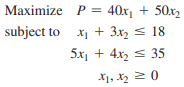 > Solve the linear programming problems using the simplex method. Repeat Problem 29 with P = 20x1 + 20x2. Data from Problem 29