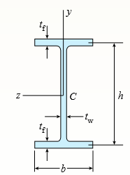 > Calculate the shape factor f for the wide flange beam shown in the figure if h = 12.2 in, b = 8.08 in, tf = 0.64 in, and tw = 0.37 in. h C - tw b.