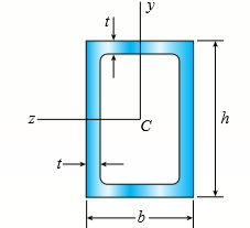 > A hollow box beam with height h = 16 in, width b = 8 in, and constant wall thickness t = 0.75 in is shown in the figure. The beam is constructed of steel with yield stress σY = 32 ksi. Determine the yield moment MY, plastic moment MP, and shap