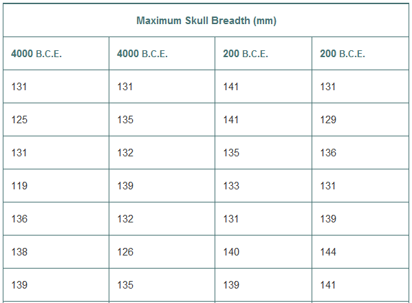 Some archaeologists theorize that ancient Egyptians interbred with several different immigrant populations over thousands of years. To see if there is any indication of changes in body structure that might have resulted, they measured 30 skulls of male Egyptians dated from 4000 b.c.e. and 30 others dated from 200 b.c.e. (A. Thomson and R. Randall-Maciver, Ancient Races of the Thebaid, Oxford: Oxford University Press, 1905)