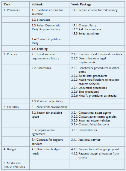 Somewhere in the United States, committee members in a voting precinct have decided to conduct a vote recount following an election. They have developed a preliminary WBS and have asked you to critique it. What are the weaknesses of this WBS?