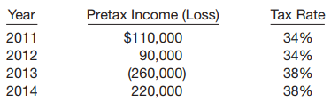 Year Pretax Income (Loss) Tax Rate 2011 $110,000 34% 2012 90,000 34% 2013 (260,000) 38% 2014 220,000 38%