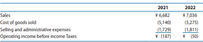 Sony Corporation manufactures and markets consumer electronics products. Assume the following are selected income statement data for 2021 and 2022 (amounts in billions of yen):