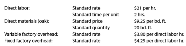 Direct Labor: Standard rate $21 per hr. Standard time per unit 2 hrs. Direct materials (oak): Standard price $9.25 per bd. ft. Standard quantity 20 bd. ft. Variable factory overhead: Fixed factory overhead: $3.80 per direct labor hr. $4.25 per direct labor hr. Standard rate Standard rate