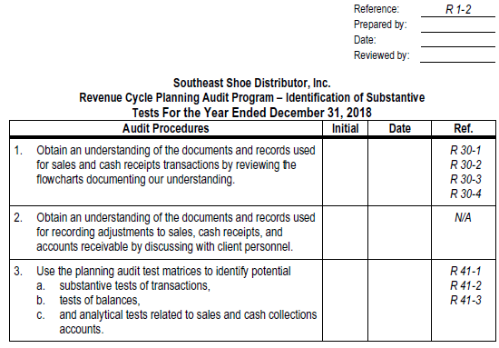 [2] Identify potential substantive tests by completing steps 3a, 3b, and 3c from the audit program R 1-2. Document your work in audit schedules R 1-2, R 41-1, R 41-2, and R 41-3. Each of these steps can be completely separately at the discretion of your instructor (Note: number your tests similar to the example provided).