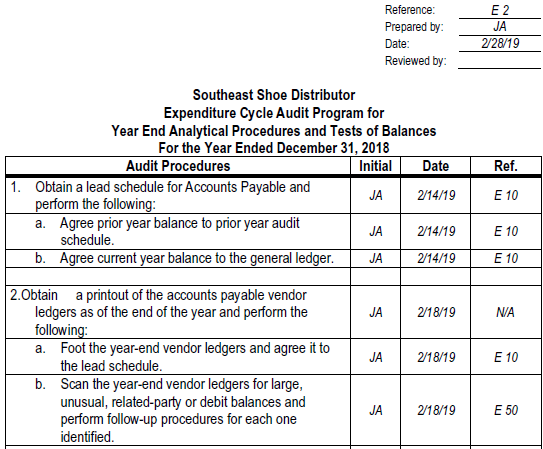 SSD is required to have an audit of its annual financial statements to fulfill requirements of loan agreements with financial institutions. This audit is to be completed in accordance with the AICPA professional standards for the audit of nonpublic companies. Your audit firm is in the process of completing the audit for the fiscal 2018 financial statements in accordance with these professional standards. The audit senior for this engagement is Jorge Hernandez. The two audit staff assigned to this engagement are Joy Avery and you. The two of you are responsible for performing the tests of balances and analytical tests outlined in the expenditure cycle audit program (referenced in the top right-hand corner as E 2).