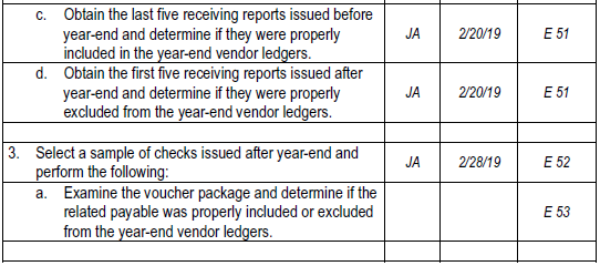 [1] Complete audit procedure 3a listed on audit program E 2. The supporting documents to be examined for this audit procedure are vouchers, vendor invoices, receiving reports, and purchase orders. Assume you have already tested 35 of the selected sample items, observing no misstatements. The documents and records for the remaining five sample items are provided at the following website www.pearsonhighered.com/beasley. SSDâs polices only require the generation of receiving reports for purchases of inventory and fixed assets. Additionally, purchase orders are not required to be generated for recurring services such as utilities and cleaning. The results from performing audit procedure 3a should be documented in audit schedule E 53. Document completion of audit procedure 3a in the audit program E 2.