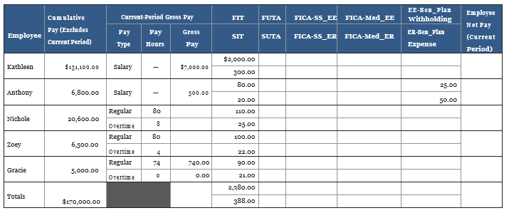 Stark Company has five employees. Employees paid by the hour earn $10 per hour for the regular 40-hour workweek and $15 per hour beyond the 40 hours per week. Hourly employees are paid every two weeks, but salaried employees are paid monthly on the last biweekly payday of each month. FICA Social Security taxes are 6.2% of the first $132,900 paid to each employee, and FICA Medicare taxes are 1.45% of gross pay. FUTA taxes are 0.6% and SUTA taxes are 5.4% of the first $7,000 paid to each employee. The company has a benefits plan that includes medical insurance, life insurance, and retirement funding for employees. Under this plan, employees must contribute 5% of their gross income as a payroll withholding, which the company matches with double the amount. Following is the partially completed payroll register for the biweekly period ending August 31, which is the last payday of August.