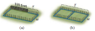 Starting with a 100-foot-long stone wall, a farmer would like to construct a rectangular enclosure by adding 400 feet of fencing, as shown in Fig. 7(a). Find the values of x and w that result in the greatest possible area.