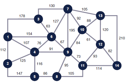 > Etisalat provides e-life home entertainment services to residents of Dubai through high-speed underground cables. Assume that the current network shows the distance between neighborhoods in kilometers. Find out the optimum length of cables required to co
