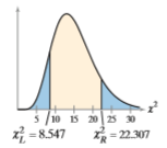 > Find the critical value(s) and rejection region(s) for the type of chi-square test with sample size n and level of significance α. Two-tailed test, n = 31, α = 0.05