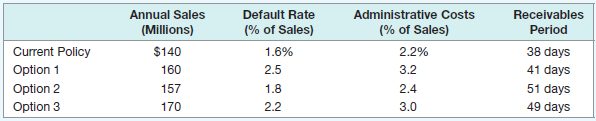 The first option is to relax the companyâs decision on when to grant credit. The second option is to increase the credit period to net 45, and the third option is a combination of the relaxed credit policy and the extension of the credit period to net 45. On the positive side, each of the three policies under consideration would increase sales. The three policies have the drawbacks that default rates would increase, the administrative costs of managing the firmâs receivables would increase, and the receivables period would increase. The effect of the credit policy change would impact all four of these variables in different degrees. Andrew has prepared the following table outlining the effect on each of these variables: