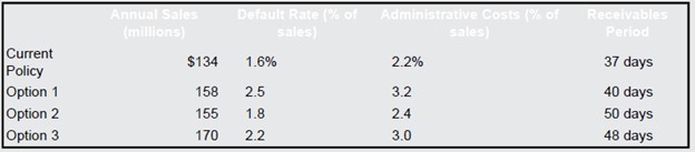 The first option is to relax the companyâs decision on when to grant credit. The second option is to increase the credit period to net 45, and the third option is a combination of the relaxed credit policy and the extension of the credit period to net 45. On the positive side, each of the three policies under consideration would increase sales. The three policies have the drawbacks that default rates would increase, the administrative costs of managing the firmâs receivables would increase, and the receivables period would increase. The effect of the credit policy change would impact all four of these variables to different degrees. Evan has prepared the following table outlining the effect on each of these variables:
